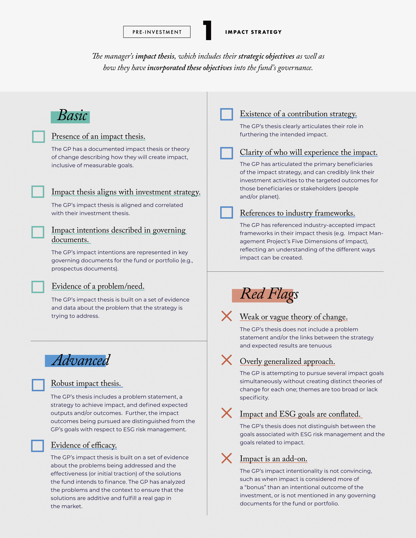 The guide offers tools and tips for allocators during due diligence and as part of their ongoing management of impact funds, as well as potential red flags that could signal a lack of rigor, capacity, and/or intentionality on the part of these managers. The resource also includes practice guides to highlight differences between light and high-touch engagement and taking into consideration a manager’s size, the size of a particular investment, and the manager’s thematic focus.