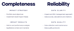 Based on this research, BlueMark designed a framework for verifying impact reports that is anchored around two key pillars — Completeness and Reliability.