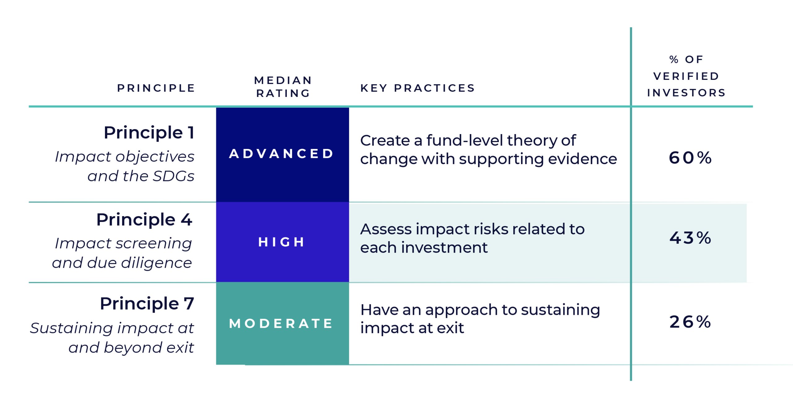 | IMPACT PRACTICE | Create a fund-level theory of change with supporting evidence | Align staff incentive systems with impact performance | Use a composite impact scoring or rating tool to assess impact across the portfolio | Assess all fundamental components of potential impact for each investment | Actively manage and engage on ESG risks with investees | Consistently monitor impact data against expectations or a target | Track and monitor results of investor contribution activities | Solicit data from end-stakeholders to validate outcomes | Have an approach to sustaining impact at exit | Use impact review findings to improve processes |