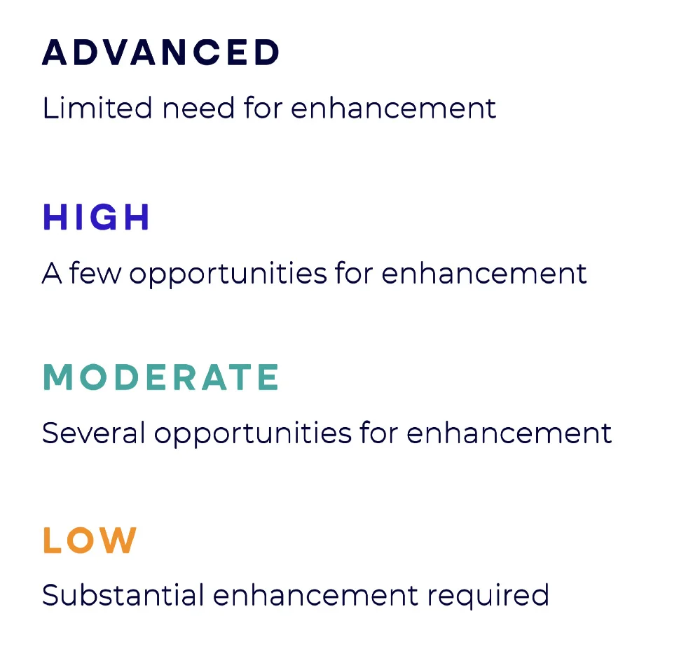 BlueMark’s proprietary rating system evaluates the degree of investor alignment with core pillars of impact management on a four-part scale (Low, Moderate, High, Advanced).